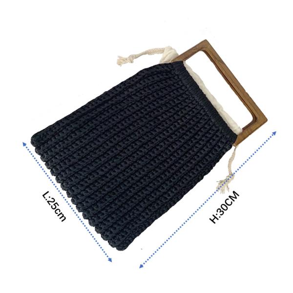 This is a hand woven wooden handle handbag made of green ice hemp material. It is made of 70% viscose filament and 30% nylon filament. It has very strong hydrophobicity, very cool hand feeling, soft and silky. Fashionable, it is a very popular handbag for women.